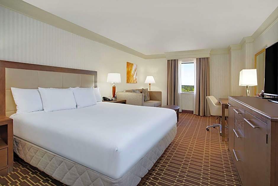 1 King Bed 1 Bedroom Suite W/Exec Flr Access is 646 square feet and includes a king-size bed 150-183 width plus desk, satellite tv , safe, and bathrobes.